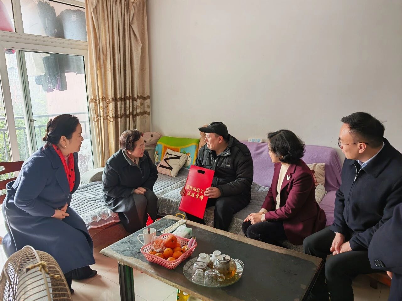 岁末年初,寒意渐浓,但关怀与温暖从未缺席。为切实把党委、政府的关怀和工会组织的温暖送到职工心坎上,近日,市人大常委会副主任、党组成员,市总工会主席陈元春带队赴两江新区开展2026年元旦春节送温暖慰问活动,并走访慰问了我司困难职工刘勇。两江新区工会主席郭丽娟、星系列楼宇工会联合会主席邱莎、同致诚公司工会主席杨渝疆陪同慰问。